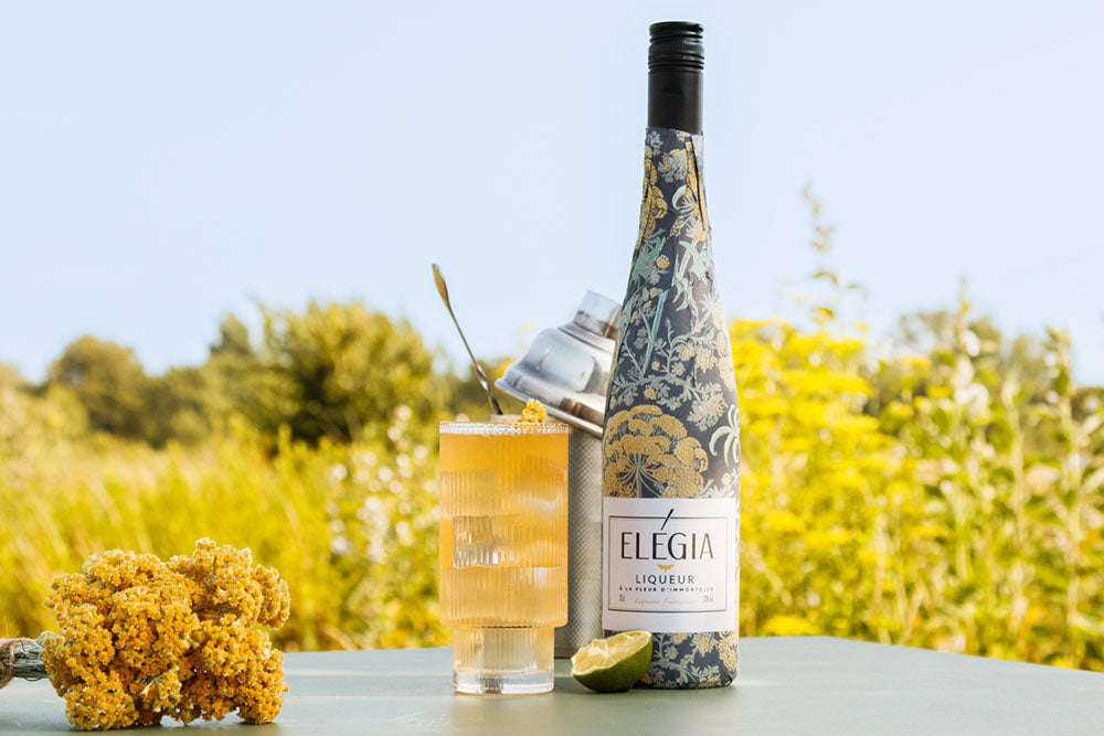 Ces fleurs nous ont guidés vers une liqueur équilibrée et riche, hommage à la diversité des botaniques. De ce parfum est né un cocktail signature : Elégia Fizz, que nous avons également décliné dans une version sans alcool.